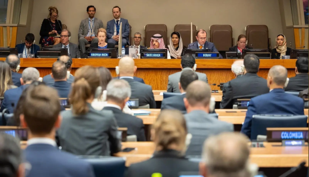 نيويورك 25-9-2025 وفا- عقد التحالف الدولي لتنفيذ حل الدولتين اجتماعا وزاريا برئاسة المملكة العربية السعودية وبالشراكة مع الاتحاد الاوروبي والنرويج، في نيويورك، بعنوان "تحويل الالتزامات إلى عمل لا رجعة فيه"، على هامش أعمال الجمعية العامة للأمم المتحدة في دورتها الثامنين.