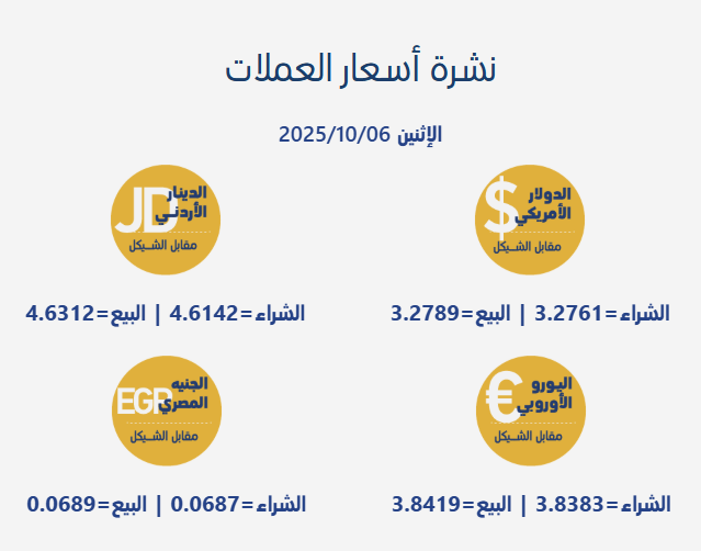 رام الله 6-10-2025 وفا- جاءت أسعار صرف العملات مقابل الشيقل الإسرائيلي، اليوم الإثنين، بحسب سلطة النقد الفلسطينية، على النحو التالي: