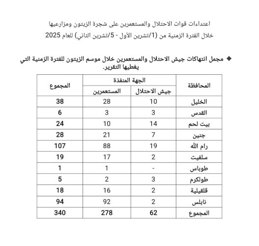 رام الله 6-11-2025 وفا- قال رئيس هيئة مقاومة الجدار والاستيطان مؤيد شعبان إن جيش الاحتلال الإسرائيلي والمستعمرين نفذوا ما مجموعه 340 اعتداء ضد قاطفي الزيتون منذ انطلاقة الموسم في الأسبوع الأول من شهر تشرين أول وحتى هذه اللحظة.