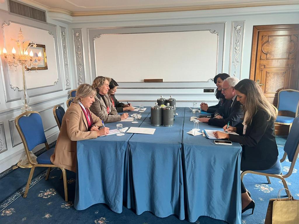 روما 2-12-2022 وفا- التقى وزير الخارجية والمغتربين رياض المالكي، اليوم الجمعة، مع رئيسة لجنة العلاقات الدولية والدفاع في مجلس الشيوخ الإيطالي ستيفانا كراكسي، على هامش أعمال مؤتمر الحوار المتوسطي المنعقد في روما.