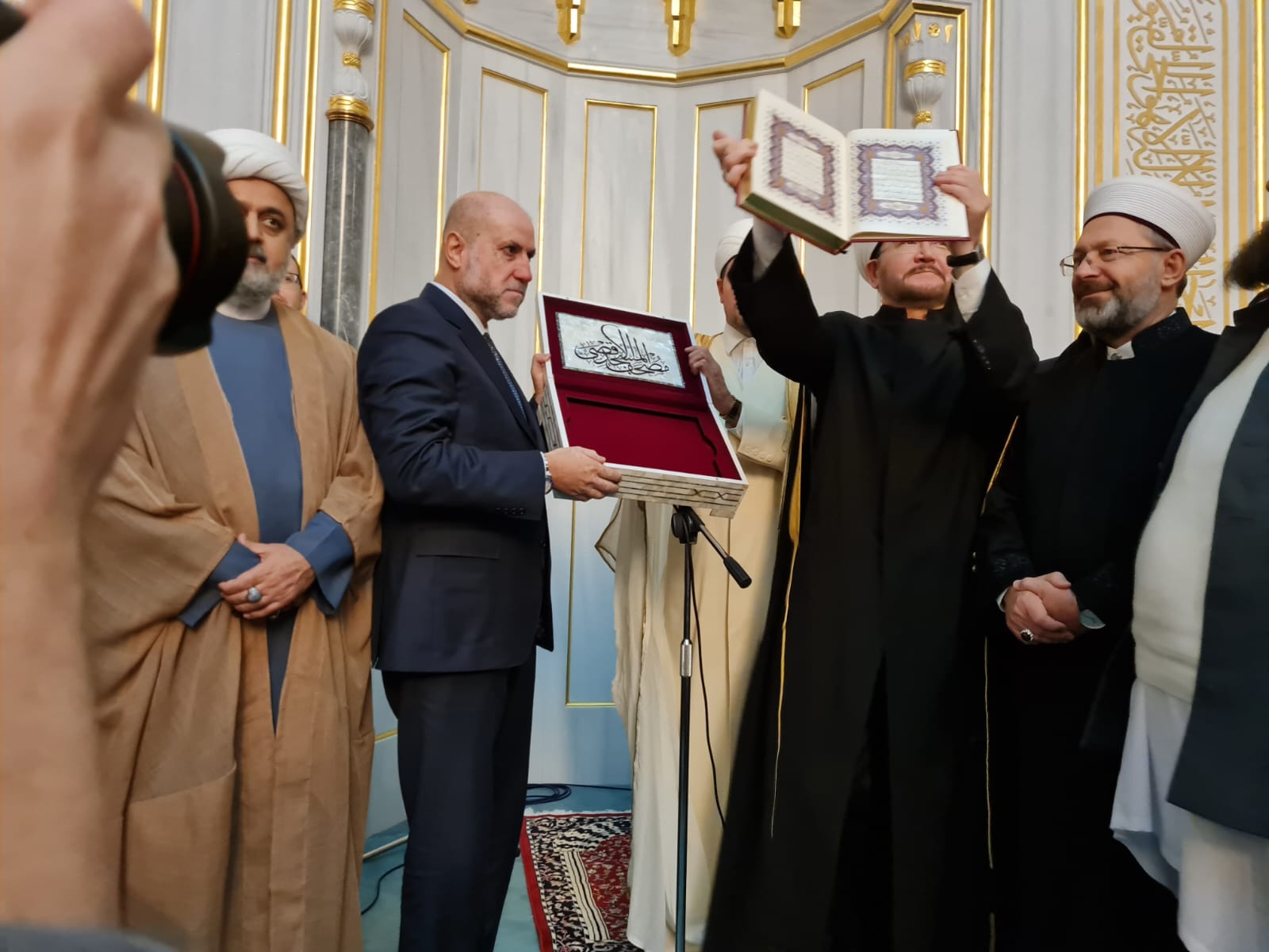 موسكو 9-12-2022 وفا- باسم رئيس دولة فلسطين محمود عباس، سلّم قاضي قضاة فلسطين، مستشار الرئيس للشؤون الدينية والعلاقات الإسلامية محمود الهباش، اليوم الجمعة، رئيس الإدارة الدينية لجمهورية روسيا الاتحادية، رئيس مجلس المفتين لروسيا الشيخ راوي عين الدين، نسخة مطبوعة من مصحف المسجد الأقصى المبارك، خلال صلاة الجمعة في مسجد موسكو بالعاصمة الروسية.