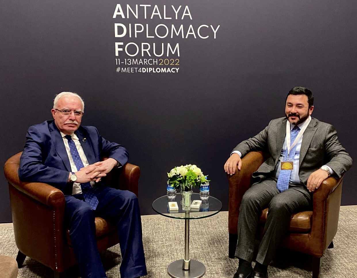 أنطاليا 14-3-2022 وفا- بحث وزير الخارجية والمغتربين رياض المالكي مع رئيس منتدى شباب التعاون الإسلامي طه ايهان، على هامش منتدى أنطاليا الدبلوماسي، سبل تعزيز التعاون المشترك.