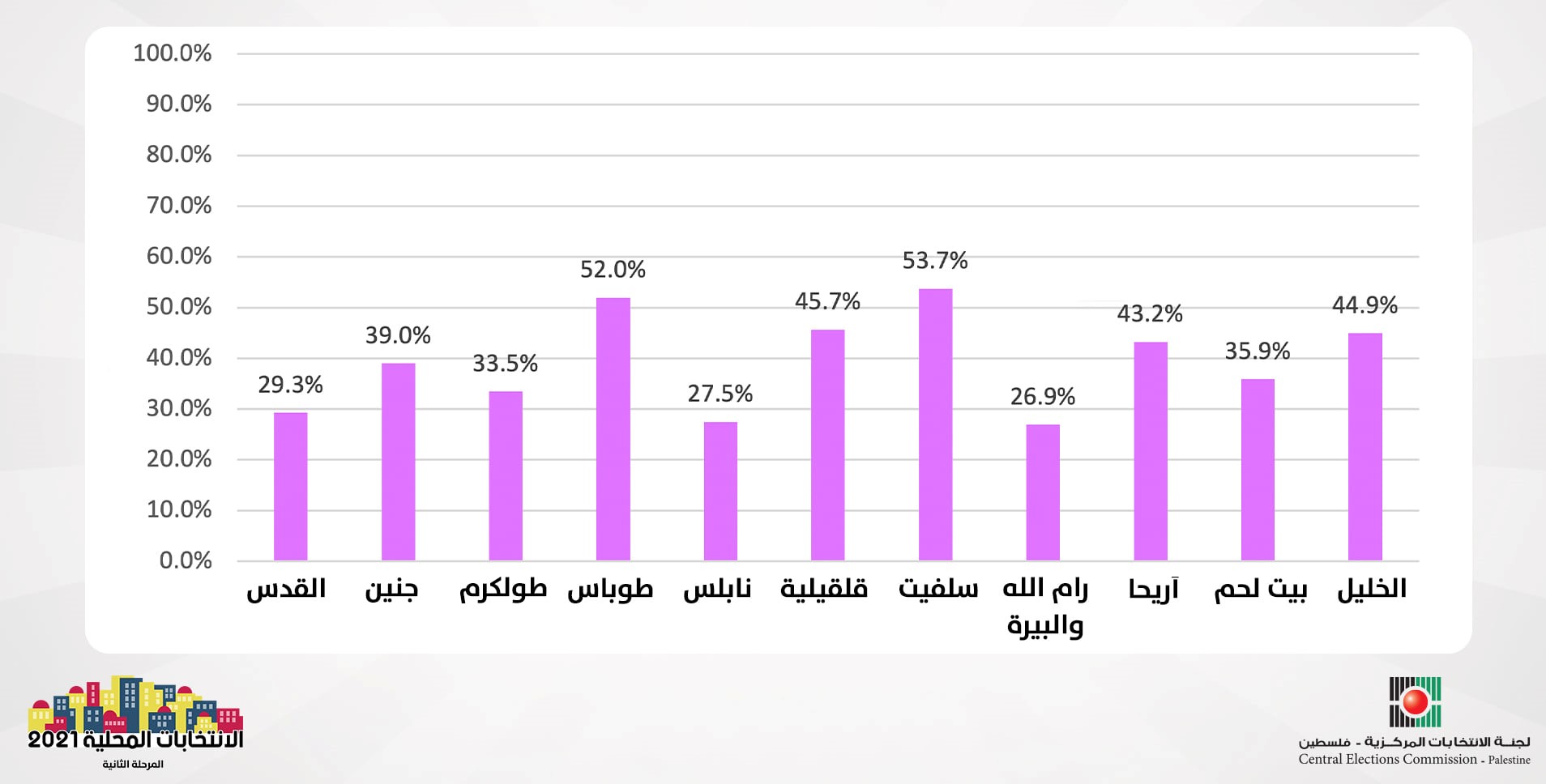 رام الله 26-3-2022 وفا- أعلنت لجنة الانتخابات المركزية، أن نسبة الاقتراع في الانتخابات المحلية "المرحلة الثانية"، بلغت 39% حتى الساعة الرابعة عصراً.