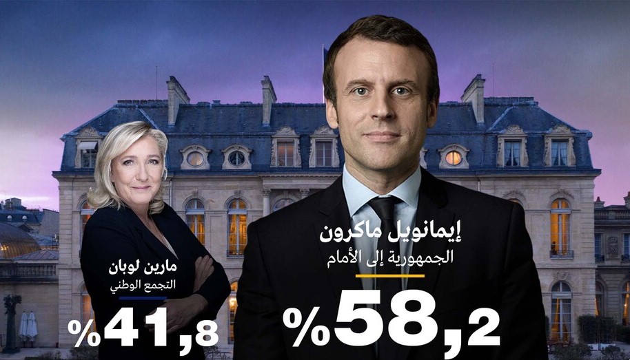 باريس 24-2-2022 وفا- فاز الرئيس الفرنسي إيمانويل ماكرون (44 عاما) بولاية ثانية بحصوله على 58.5 بالمئة من الأصوات مقابل 41.5 بالمئة لمنافسته زعيمة "التجمع الوطني" مارين لوبان (53 عاما)، وفق تقديرات أولية.