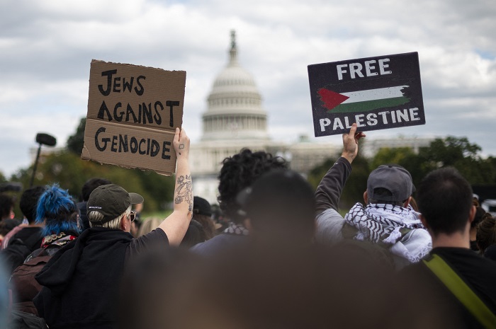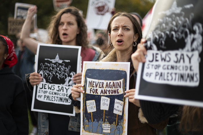 واشنطن 19-10-2023 وفا- نظمت حركة "الصوت اليهودي من أجل السلام"، الليلة، تظاهرة حاشدة أمام مبنى الكونغرس الأميركي في العاصمة واشنطن، تنديدا بالعدوان الإسرائيلي على قطاع غزة، بمشاركة المئات من الأميركيين.