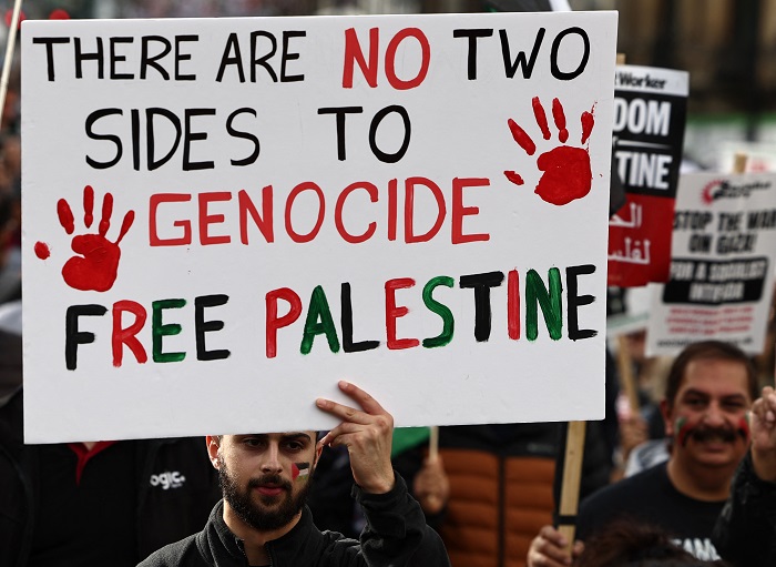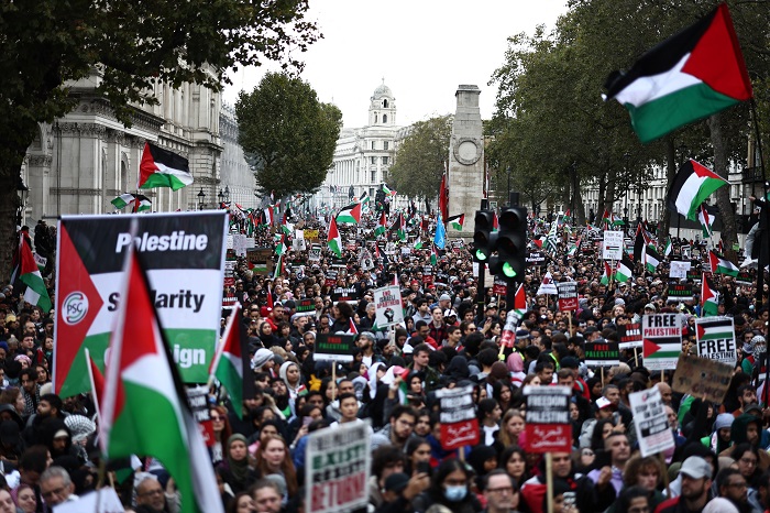 لندن 21-10-2023 وفا- تظاهر عشرات الآلاف من البريطانيين، مساء اليوم السبت، في العاصمة لندن، تضامنًا مع شعبنا، وتنديدا بالعدوان الإسرائيلي المتواصل على قطاع غزة.
