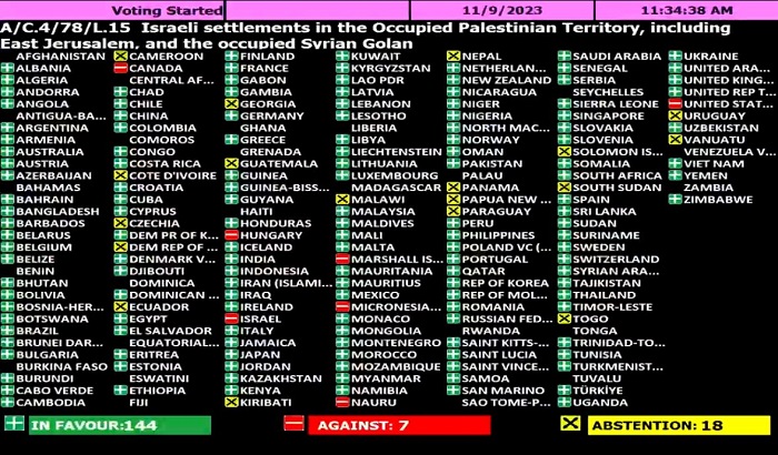 كما اعتمدت اللجنة قرار الاستيطان الإسرائيلي، الذي حصل على دعم 144 دولة، في حين صوتت ضده 7 دول (إسرائيل، والولايات المتحدة، وكندا، وهنجاريا، وجزر المارشال، وميكرونيسيا، وناورو) وامتنعت 18 دولة عن التصويت.