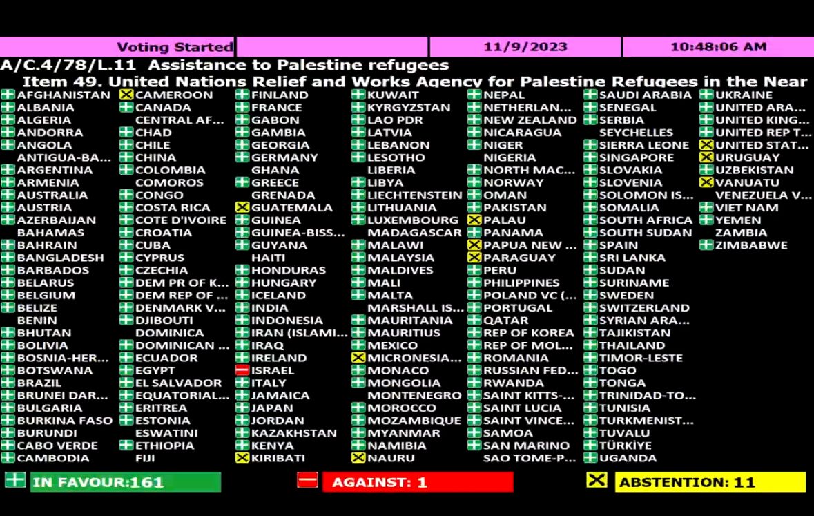 وحاز القرار على دعم 161 دولة، في حين صوتت ضده إسرائيل فقط، وامتنعت 11 دولة عن التصويت، منها الولايات المتحدة.