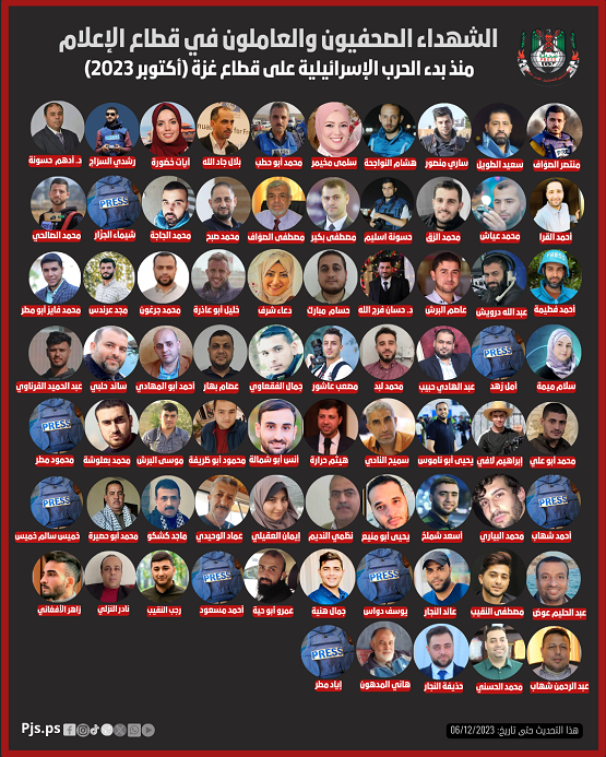 رام الله 6-12-2023 وفا- قالت نقابة الصحفيين إن الاحتلال الإسرائيلي ارتكب مئات الجرائم والانتهاكات الجسيمة بحق الصحفيين ووسائل الاعلام في الضفة الغربية وقطاع غزة، من ضمنها استشهاد وجرح وفقدان عشرات منهم، وتدمير منازل لهم ولعائلاتهم، وتدمير مقار إعلامية.