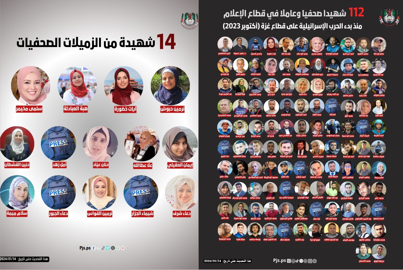 وأوضحت النقابة، في بيان لها، مساء اليوم الأحد، أنه ووفق رصد لجنة الحريات التابعة للنقابة وفي اليوم الـ100 للعدوان على قطاع غزة وبارتقاء الزميل مصور قناة الغد العربي يزن زويدي، يصل عدد الشهداء إلى 112 شهيدا من بينهم 14 من الزميلات .