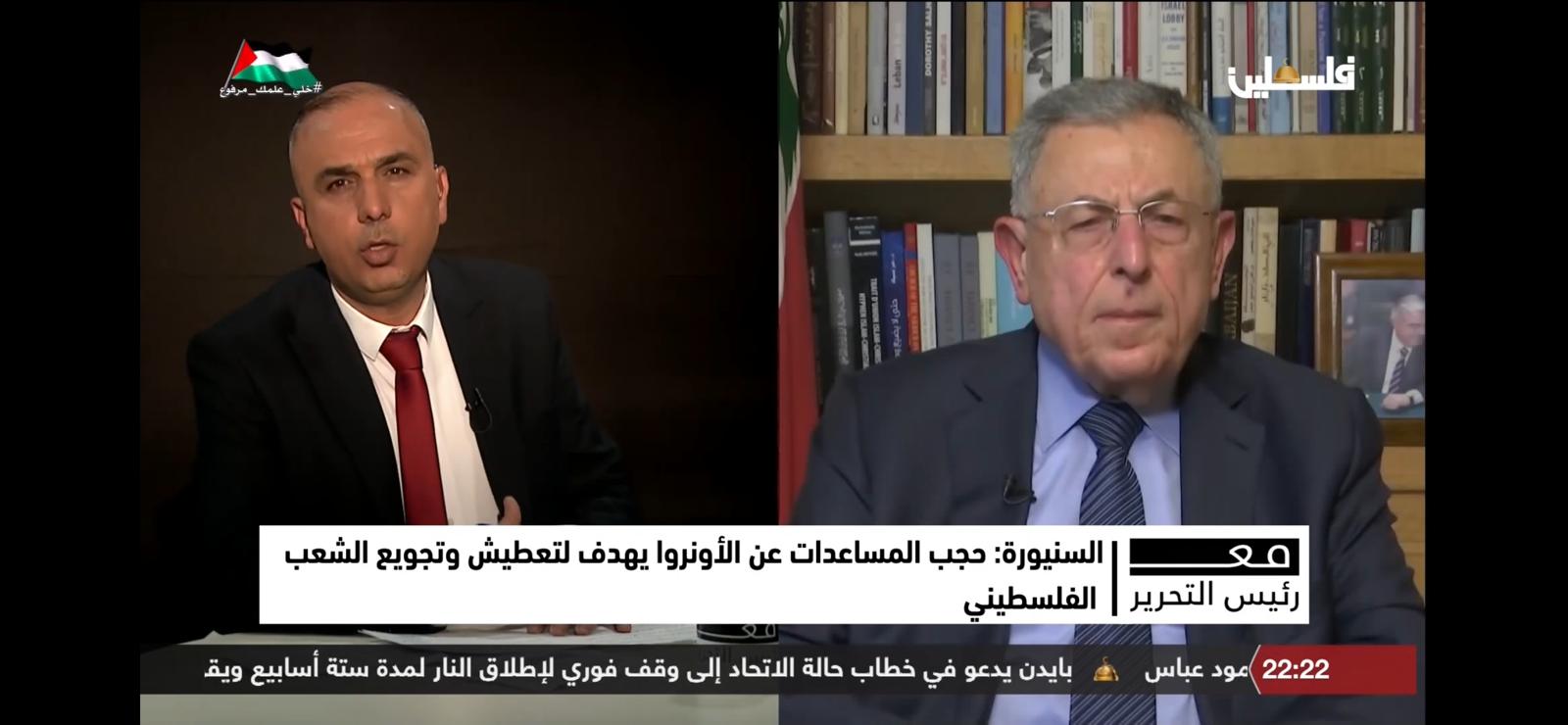 وفي سياق متصل يتعلق باستهداف حكومة الاحتلال وكالة غوث وتشغيل اللاجئين "أونروا"، قال إن "اسرائيل تسعى إلى تشويه القضية الفلسطينية وتشويه الوكالة، وفي مقال سابق لي قمت بنشره بعدة صحف أكدت على ضرورة تضافر الجهود من أجل متابعة قضيتنا والدفاع عنها واستحقاق الفلسطنيين لحل عادل"، مشدداً على ضرورة اجراء الاتصالات على كافة الأصعدة من أجل وقف المساس بالوكالة.