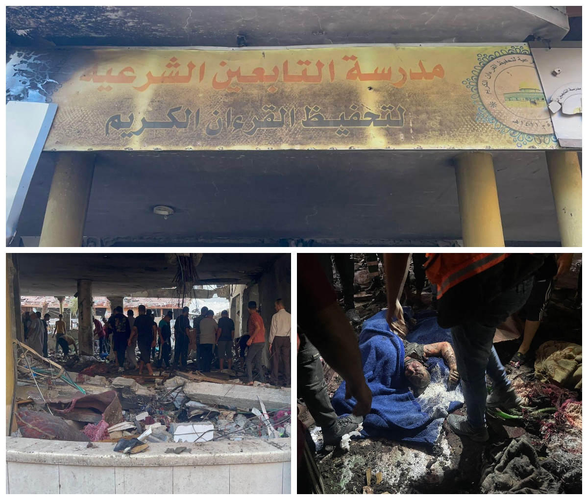 وأفادت مصادر محلية، بأن طيران الاحتلال الحربي قصف مدرسة "التابعين" التي تؤوي نازحين في منطقة الصحابة بحي الدرج شرق مدينة غزة، بثلاثة صواريخ بشكل مباشر، وذلك خلال أداء المواطنين صلاة الفجر في المصلى.