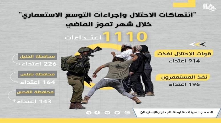 الاحتلال ومستعمروه نفذوا 1110 اعتداءات في تموز الماضي