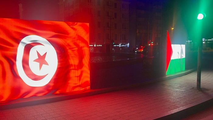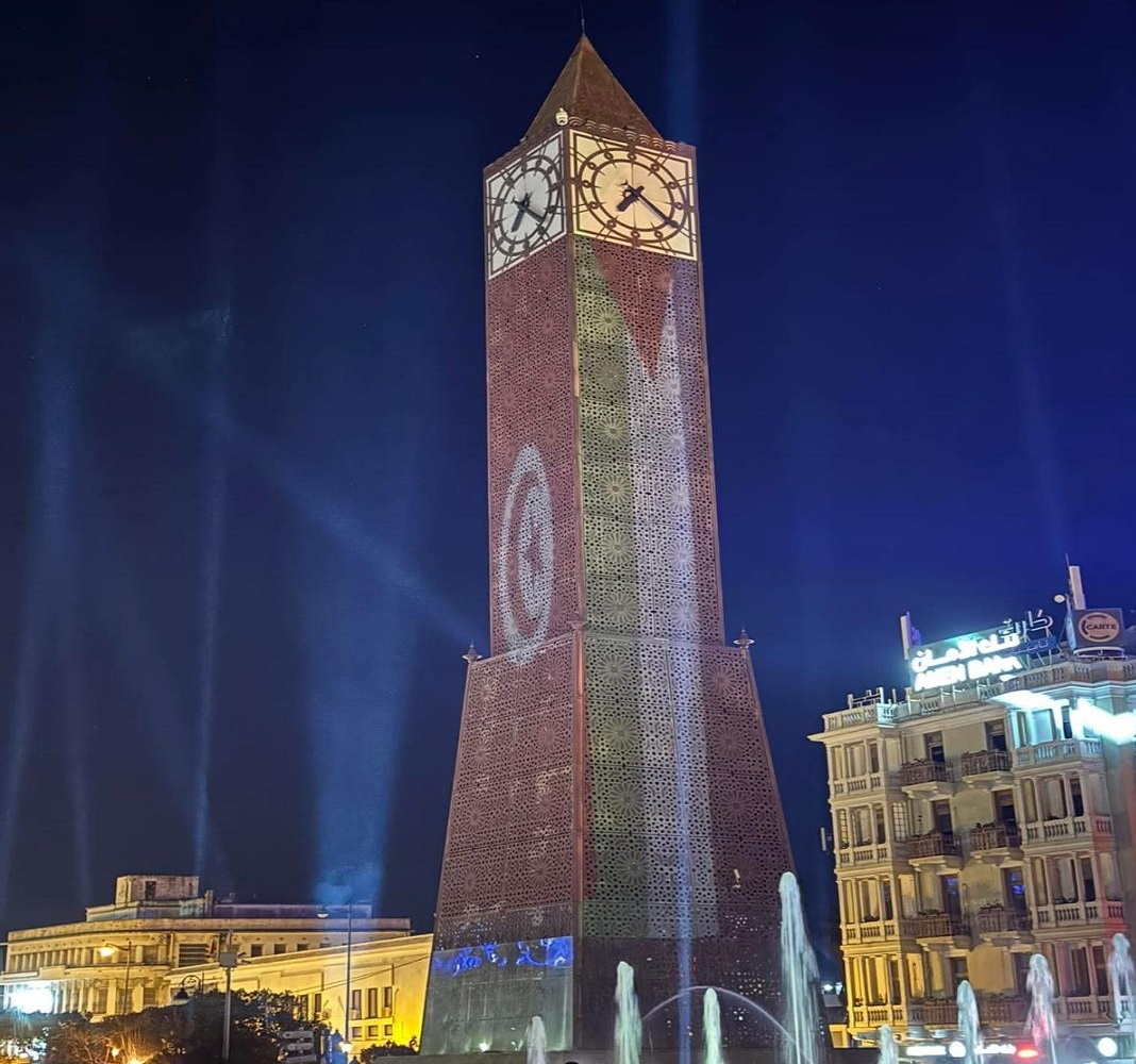 تونس: إضاءة ساحة الساعة بالعلمين الفلسطيني والتونسي