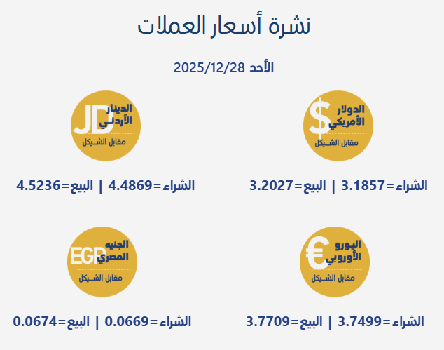 رام الله 28-12-2025 وفا- جاءت أسعار صرف العملات مقابل الشيقل الإسرائيلي، اليوم الاحد، بحسب سلطة النقد الفلسطينية، على النحو التالي: