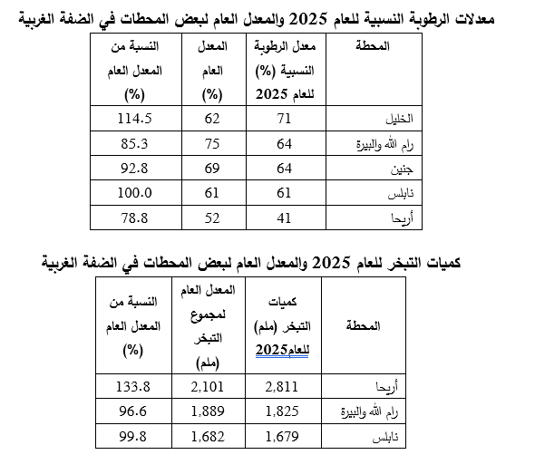 وفيما يتعلق بدرجات الحرارة، أوضح البيان أن عام 2025 شهد ارتفاعاً عن المعدلات السنوية العامة في كافة محطات الضفة الغربية، وبرز ذلك بشكل واضح في محطة أريحا التي تأثرت بموجات حر قوية خلال شهري تموز وآب، حيث بلغ الارتفاع عن المعدل العام فيها 3.3 درجة مئوية، كما سجلت درجات الحرارة الصغرى ارتفاعاً تراوح ما بين 0.6 درجة مئوية في رام الله والبيرة، و5.2 درجة مئوية في أريحا.