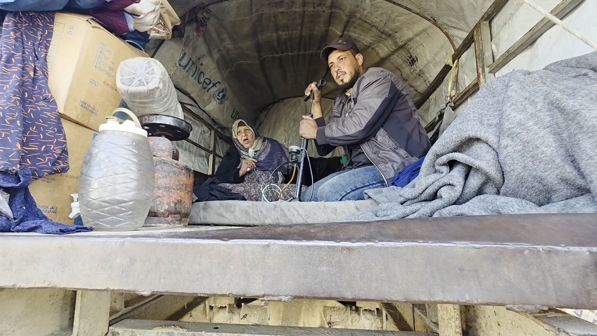 داخل عربة نزوح يعاني سامي أبو سعادة ووالدته في توفير العلاج