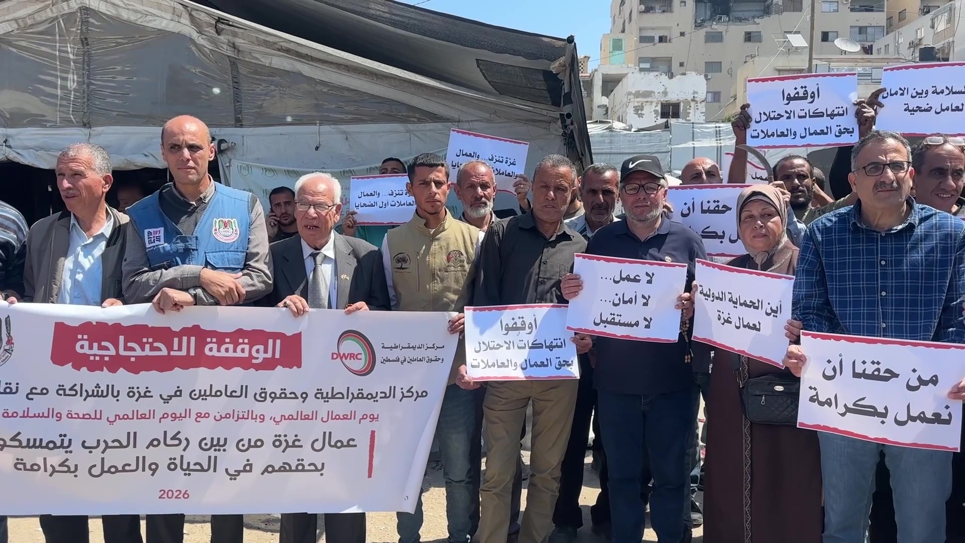 وقفة في دير البلح وسط قطاع غزة للمطالبة بحقوق العمال وتسليط الضوء على الأوضاع المعيشية الصعبة، عشية يوم العمال العالمي.